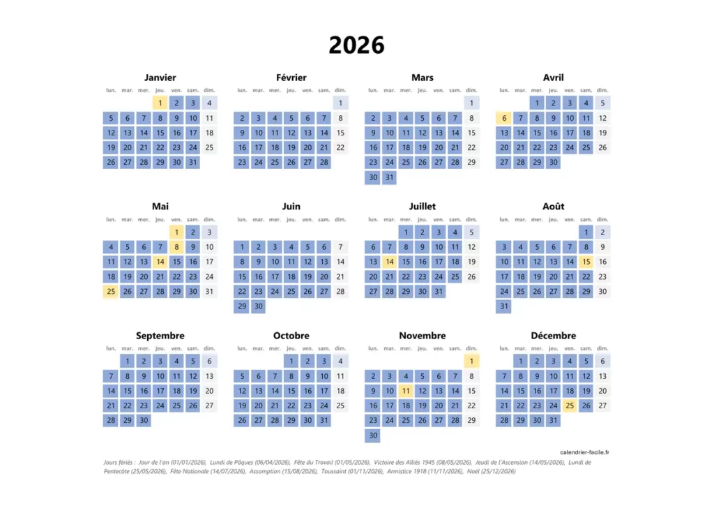 🇫🇷 Jours fériés et numéros de semaine 2026 inclus