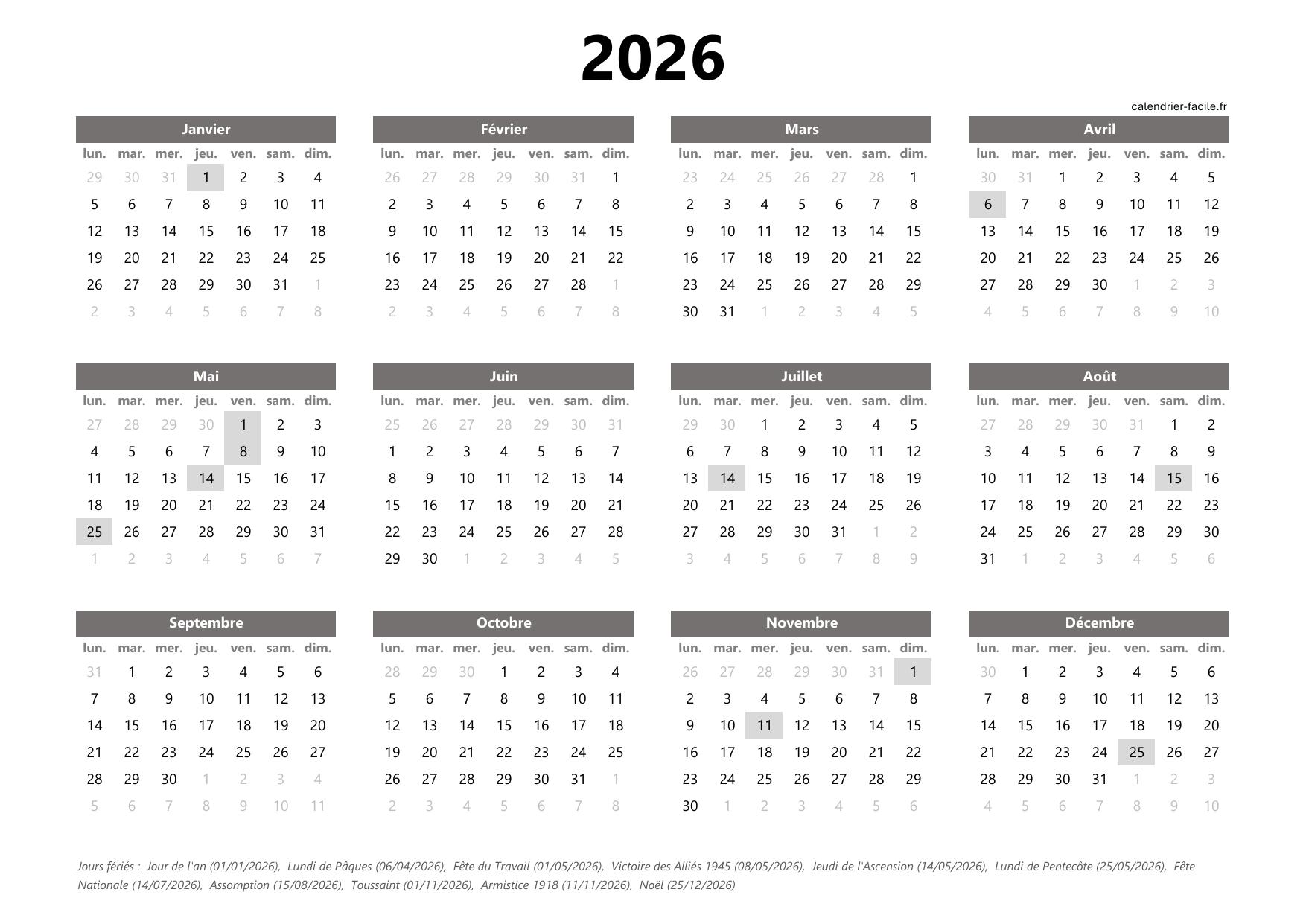 Tous les calendriers annuels 2026 affichent les jours fériés de l’année en France métropolitaine.