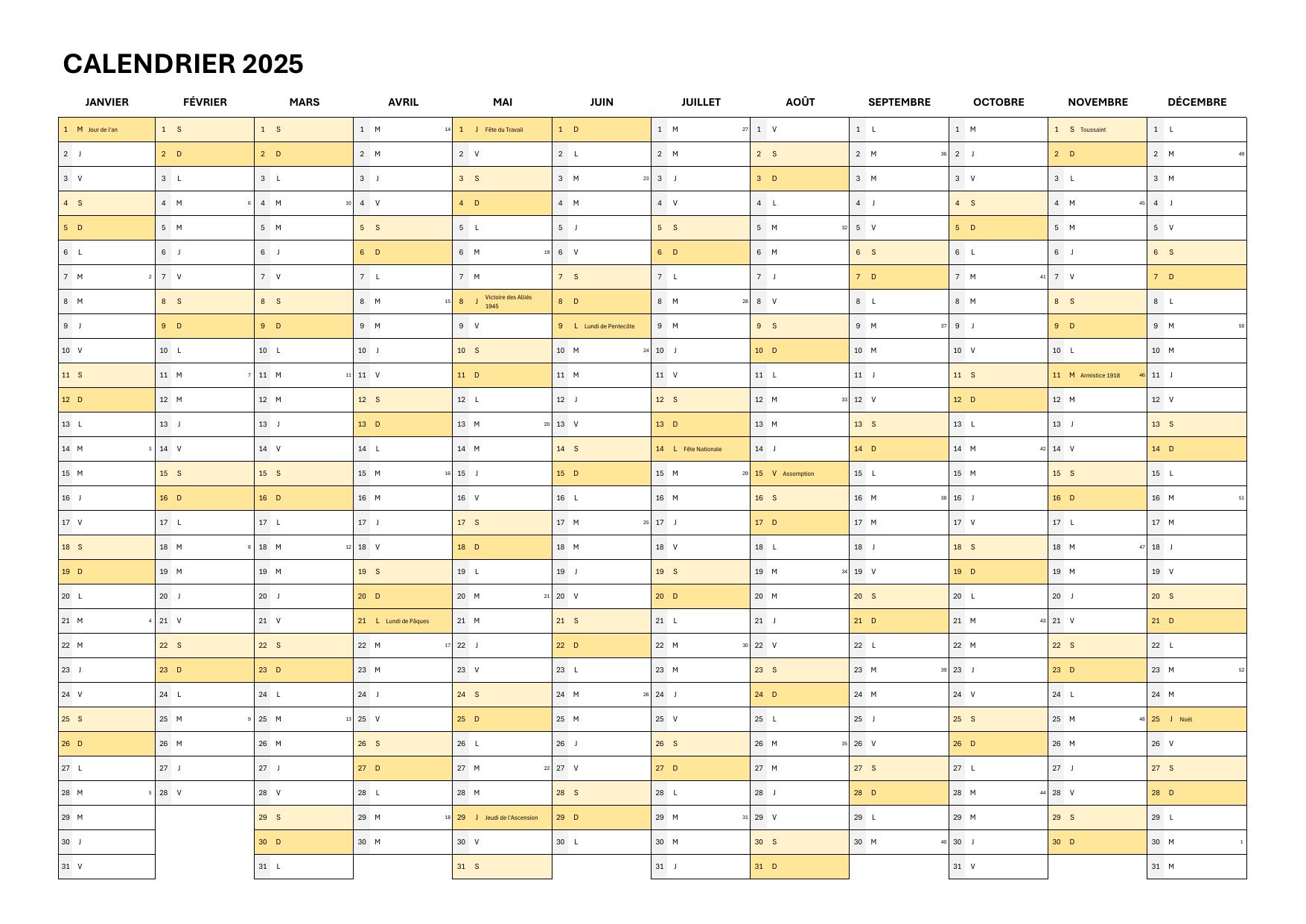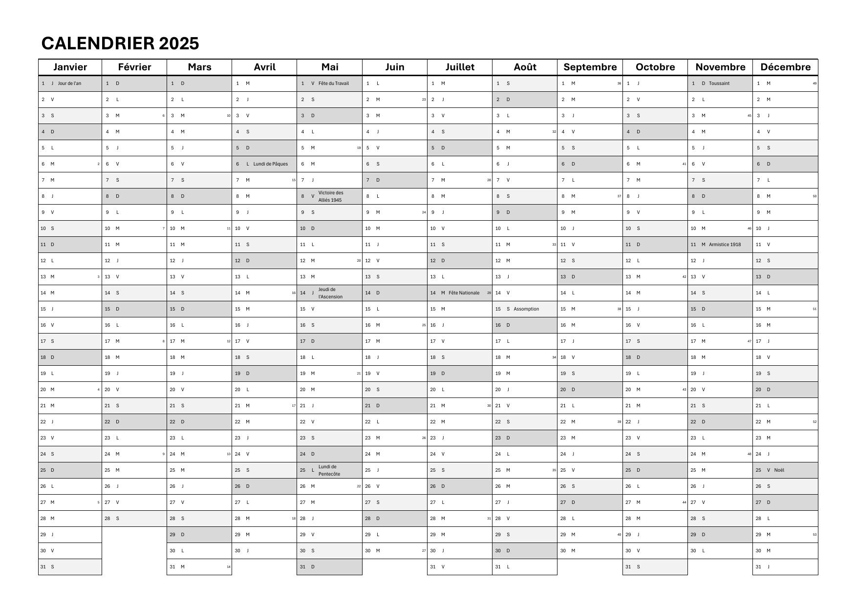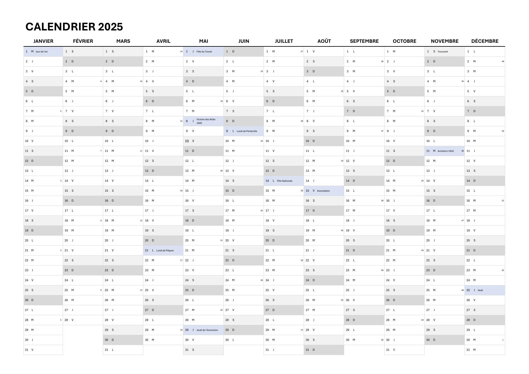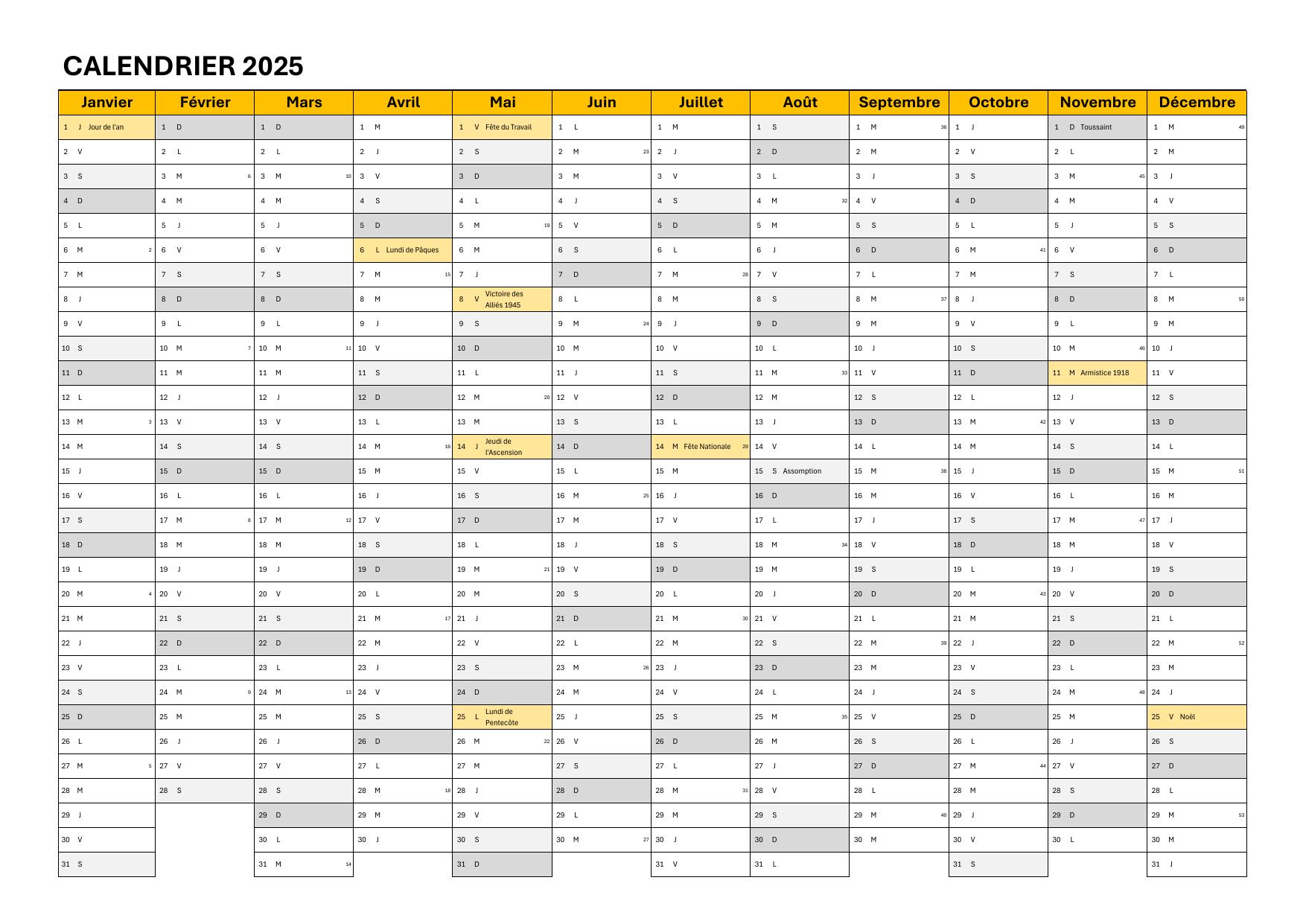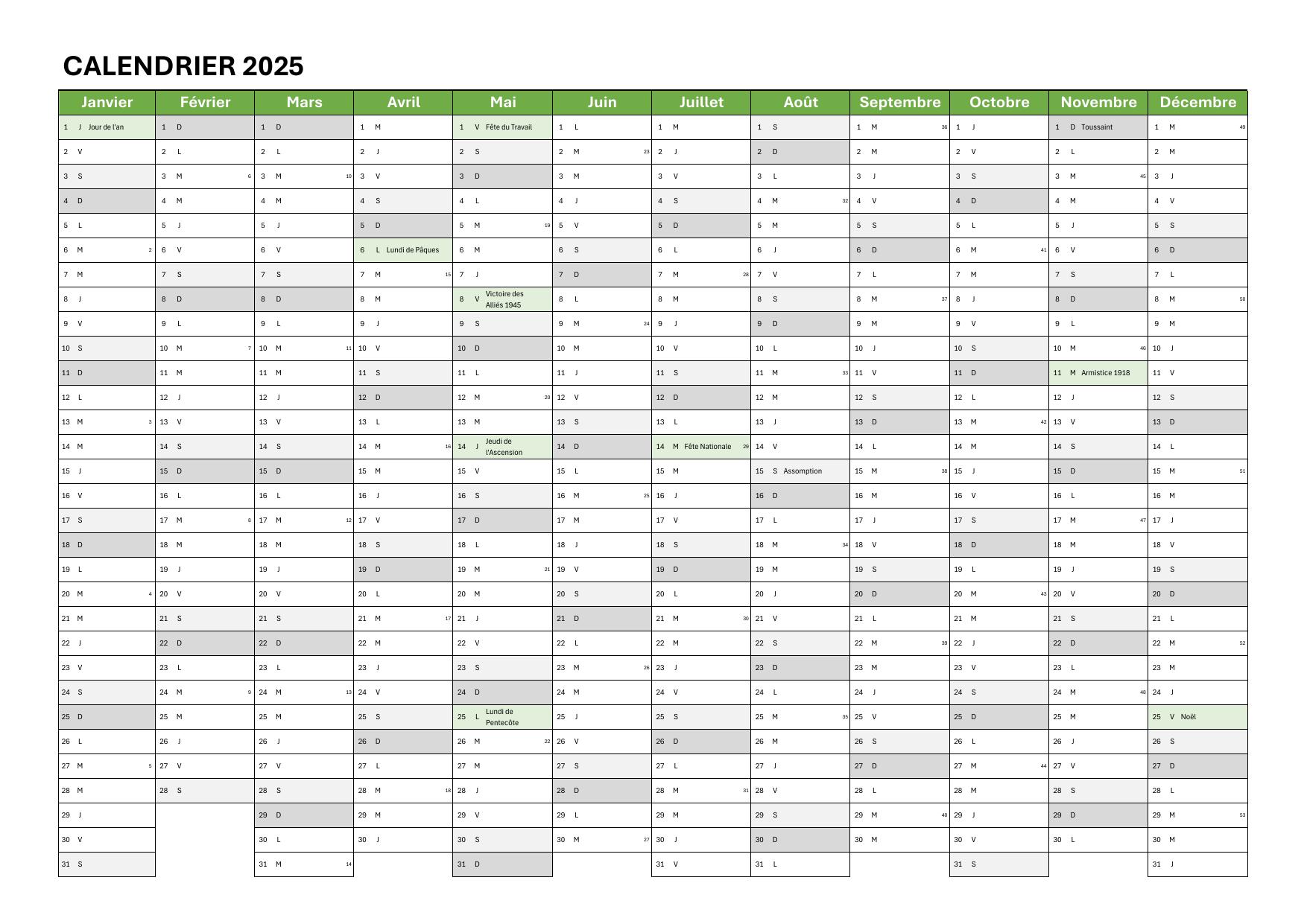Tous les fichiers sont optimisés pour le format A4 en paysage, avec les jours fériés 2025 déjà intégrés.