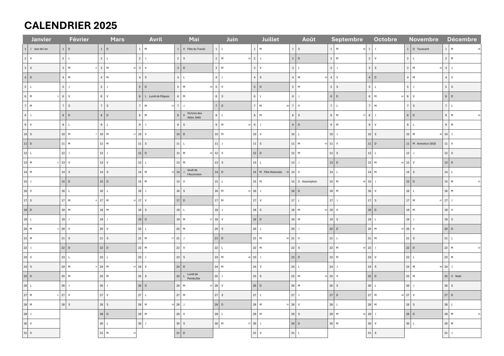 🗓️ Les plannings annuels 2025 – une année en un seul regard