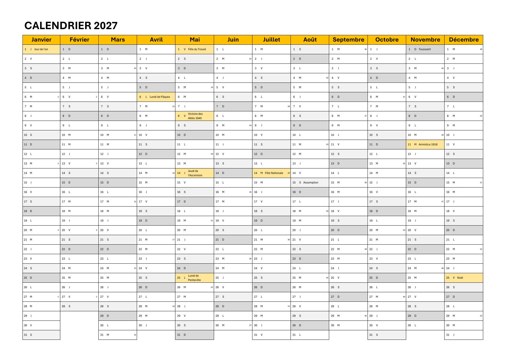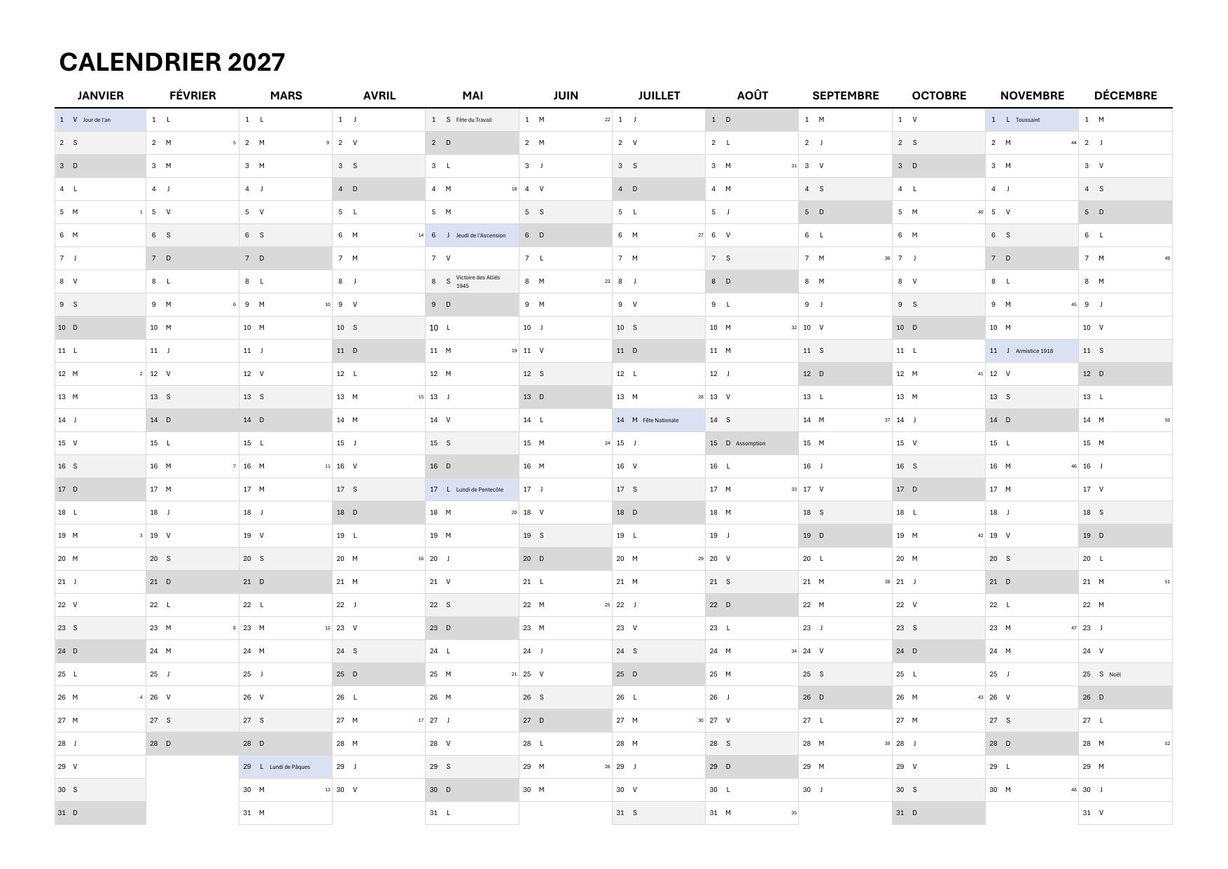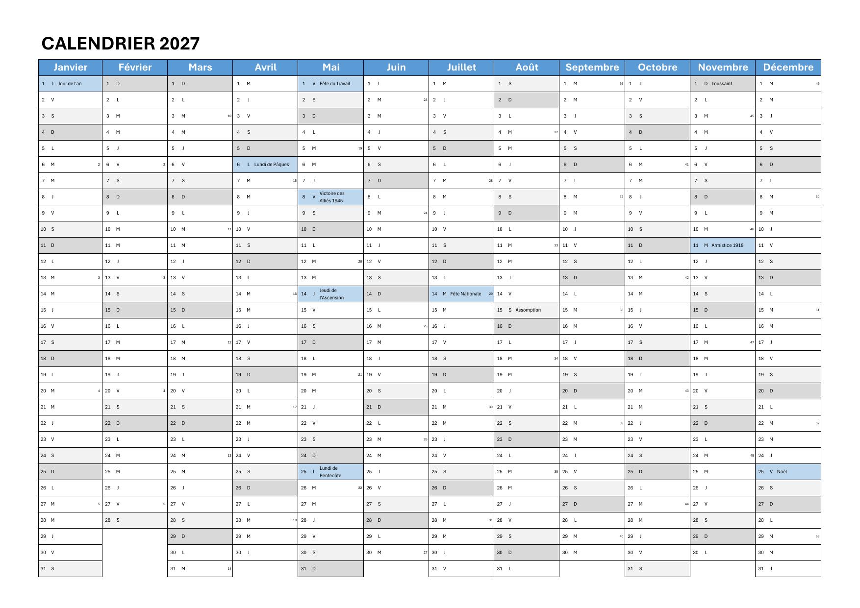 Chaque modèle intègre automatiquement les jours fériés 2027 en France métropolitaine.