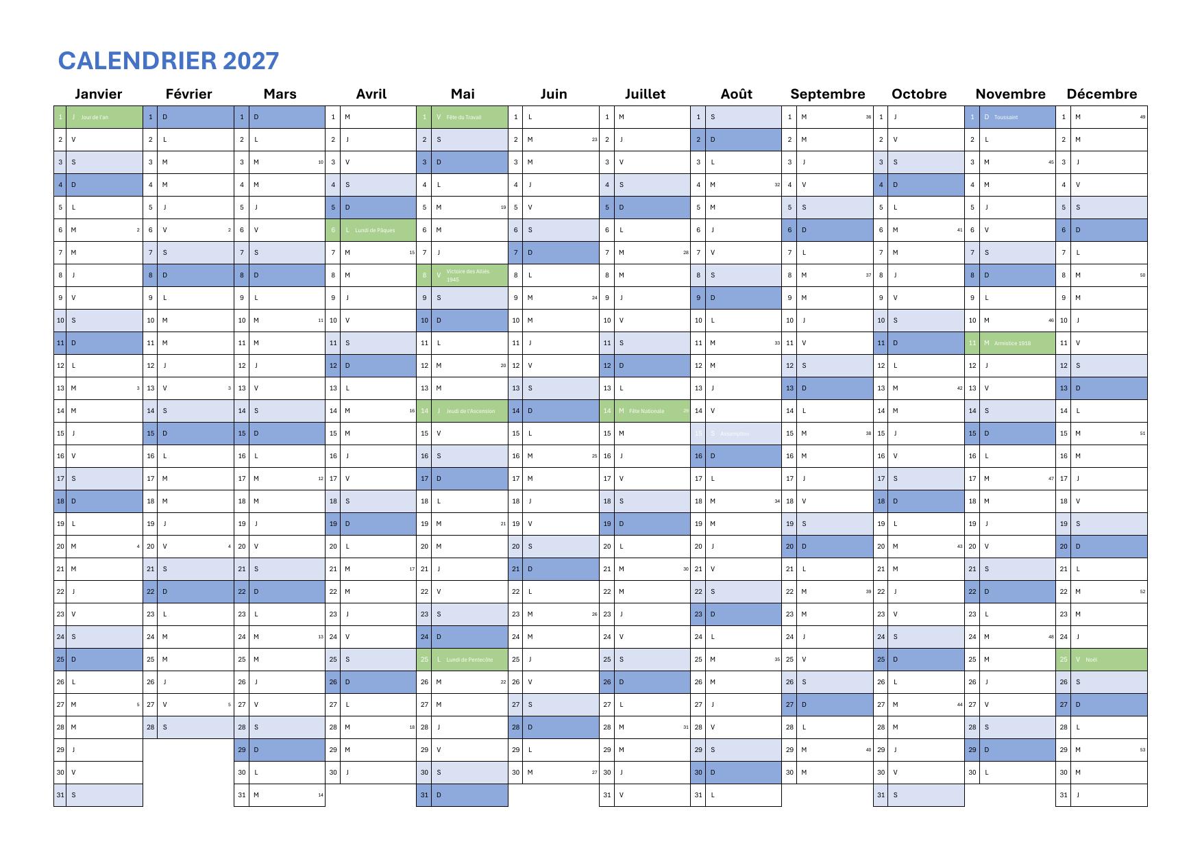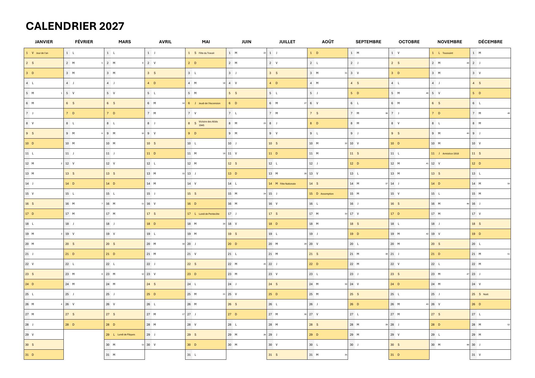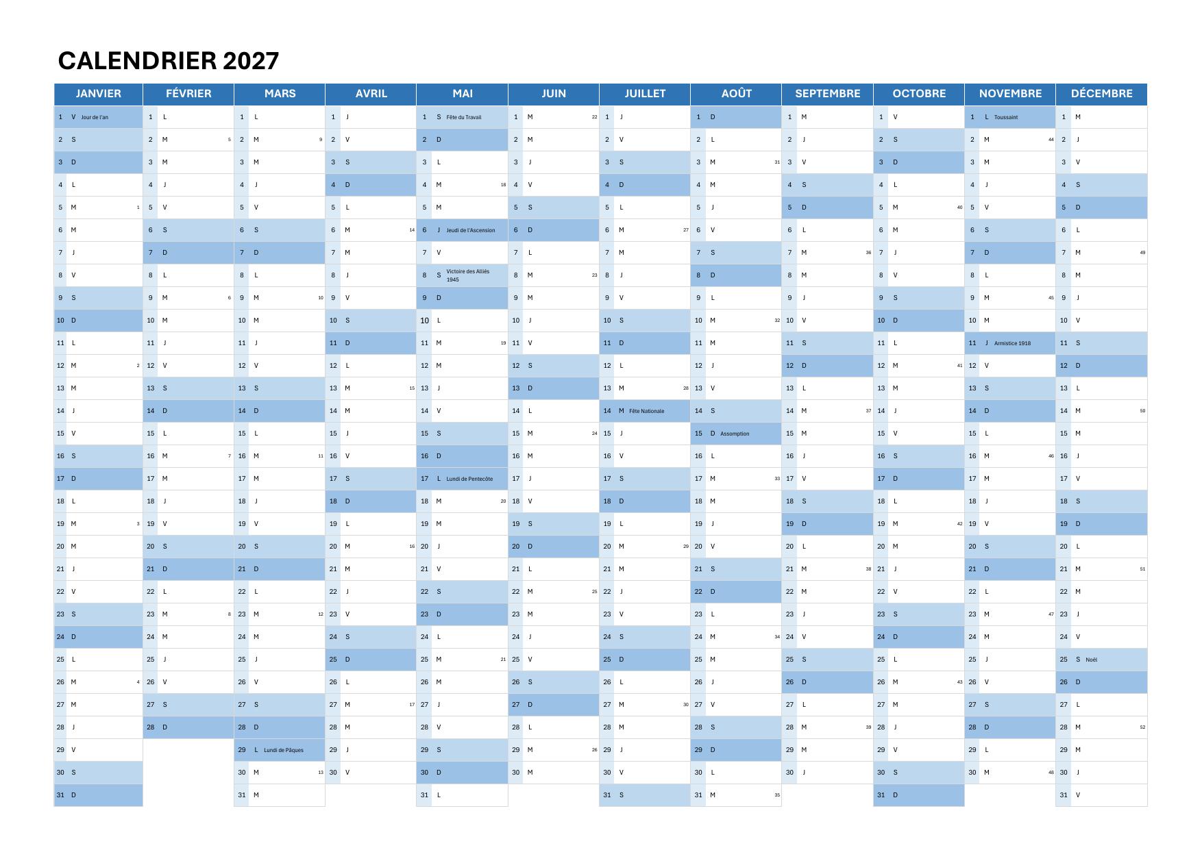 Chaque modèle intègre automatiquement les jours fériés 2027 en France métropolitaine.