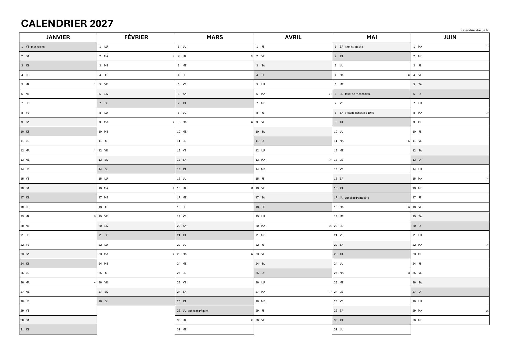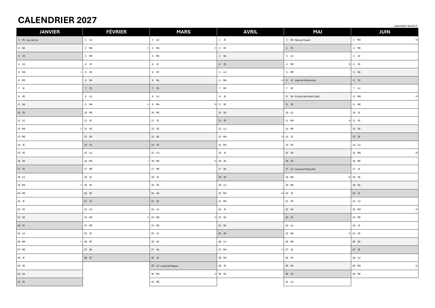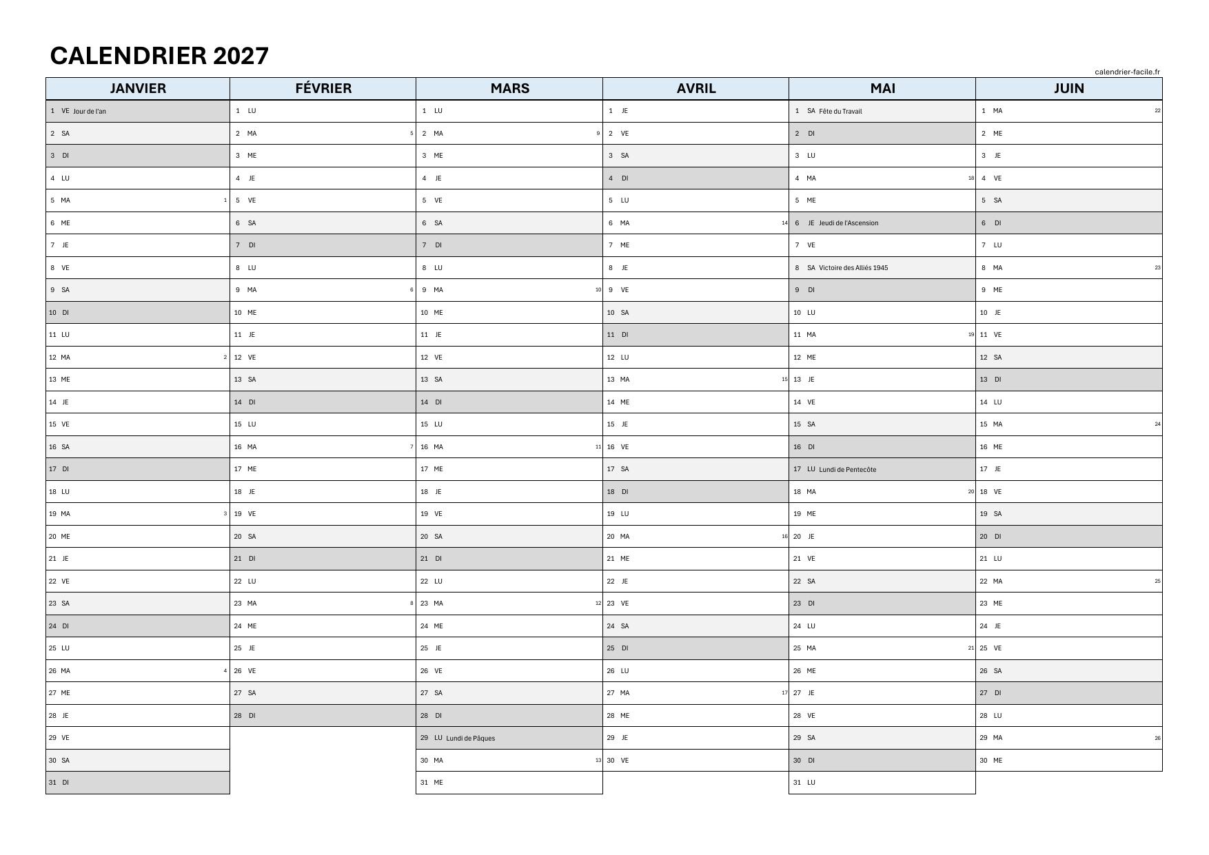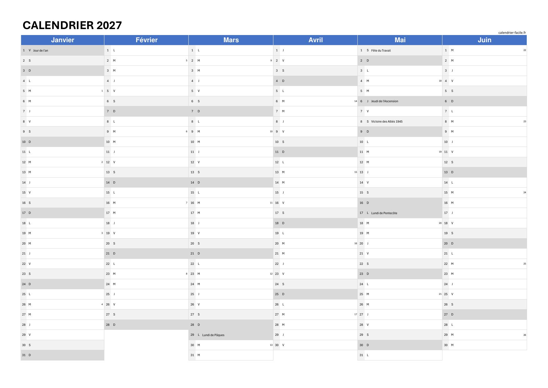 Plannings annuel et semestriels 2027 à télécharger et à imprimer gratuitement