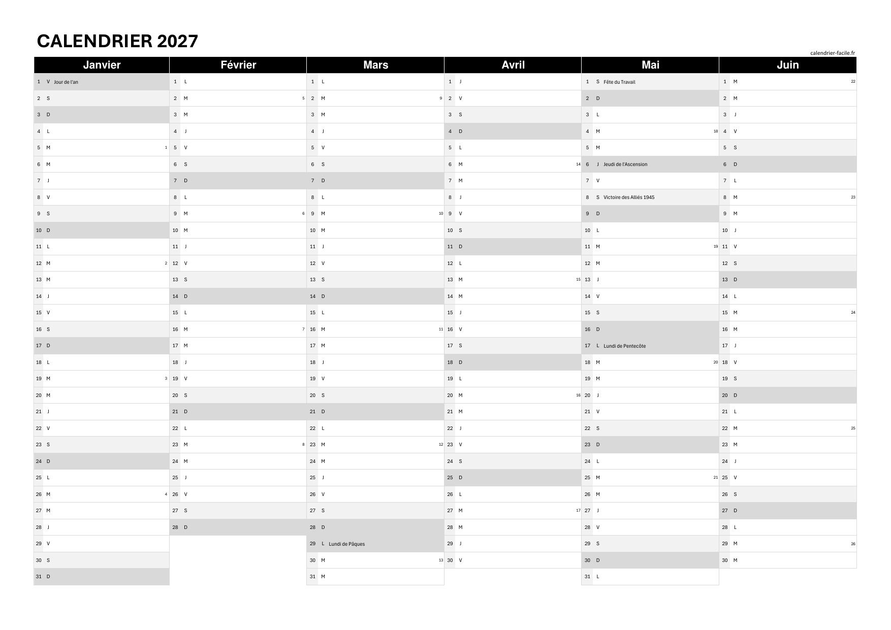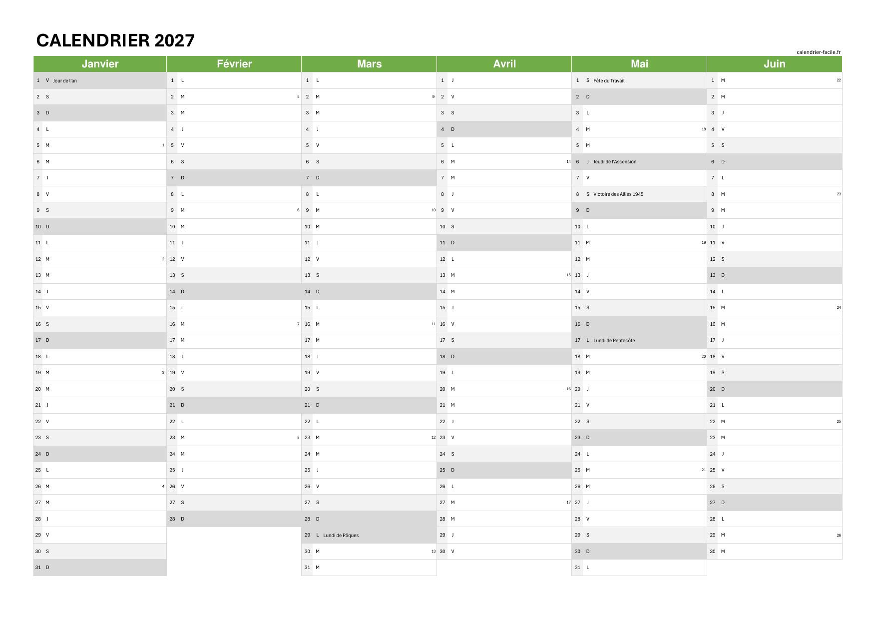 Tous les plannings 2027 proposés sur cette page sont gratuits et accessibles sans inscription.